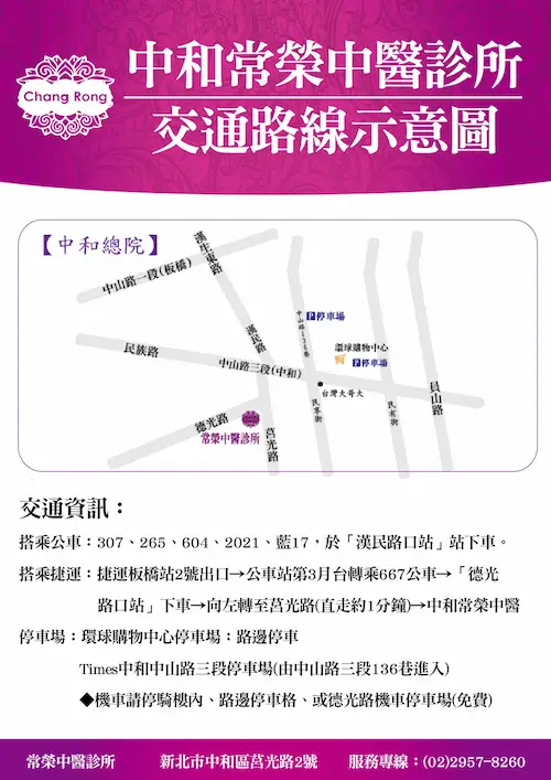 捷運板橋站2號出口 → 公車站第3月台轉乘667公車 → 「德光路口站」下車 → 向右轉至莒光路(直走約一分鐘)→ 中和常榮中醫